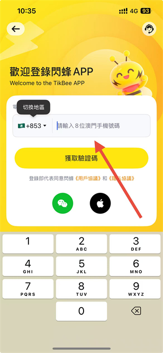4、選擇地區(qū),輸入8位澳門(mén)手機(jī)號(hào)碼,點(diǎn)擊獲取驗(yàn)證碼,輸入驗(yàn)證碼完成登錄。