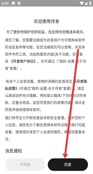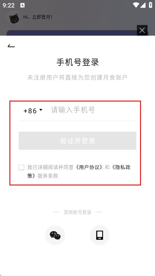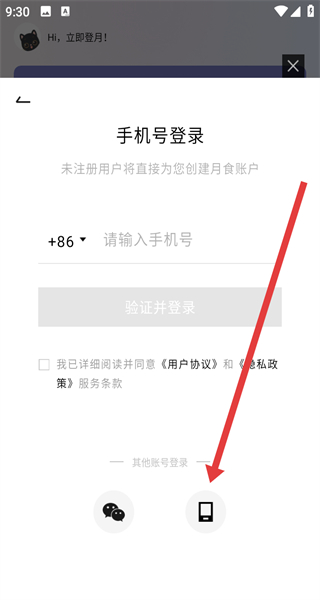 1、點擊同意按鈕,同意月食的用戶協(xié)議和隱私政策,進入登錄界面。