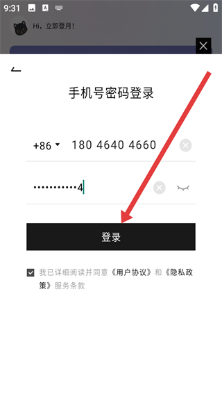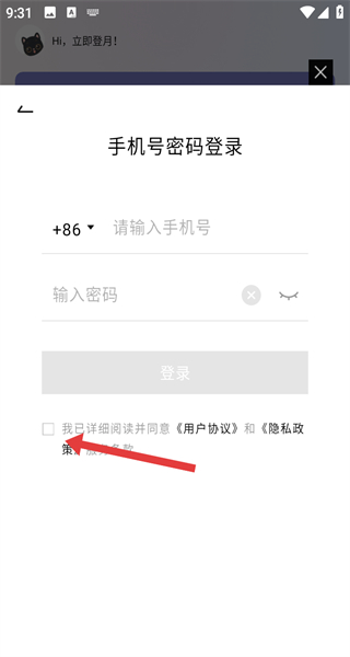 3、輸入手機號碼和密碼,勾選我已詳細閱讀并同意《用戶協(xié)議》和《隱私政策》服務條款選項。