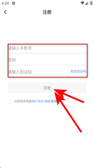 4、在注冊的頁面,輸入手機號等信息后,點擊注冊完成賬號注冊操作。