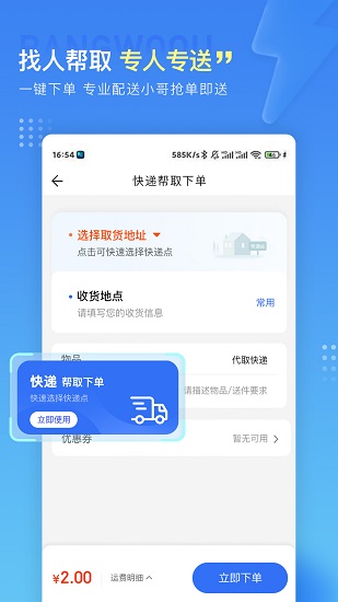 幫我取是一款十分優(yōu)質(zhì)的配送app,專為住在鄉(xiāng)村路途不便的村民打造,可以很好的幫助用戶幫取快遞,幫送物品,極大的便捷了用戶的日常生活,只要在軟件線上預(yù)約就會(huì)有專業(yè)的人士來上門幫取幫送,十分方便快捷,有需要的朋友快來下載吧!