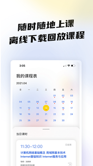 隨時隨地上課,離線下載回放課程,課程日歷展示,課程安排一目了然。