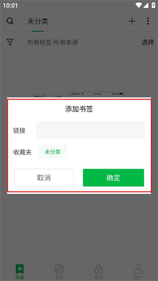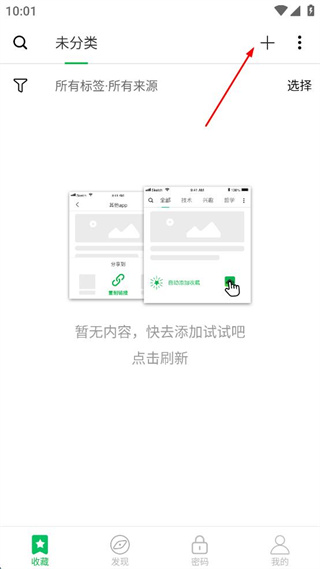 3、進(jìn)入主界面后,點(diǎn)擊右上角“+”號(hào),彈出添加書簽窗口。