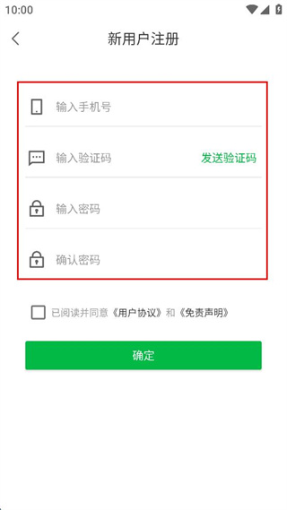 2、在注冊(cè)界面,依次輸入手機(jī)號(hào)、驗(yàn)證碼、密碼、確認(rèn)密碼,勾選同意協(xié)議后點(diǎn)擊確定。