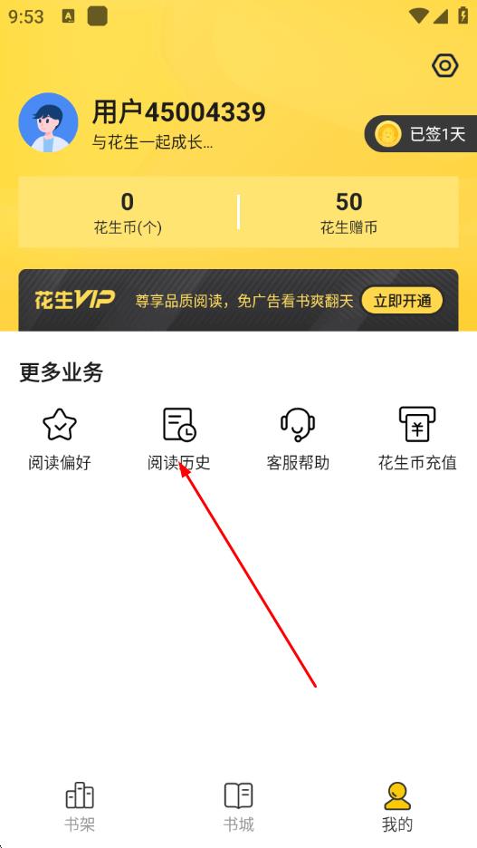 2、在我的頁面,找到并點(diǎn)擊閱讀歷史選項(xiàng)。