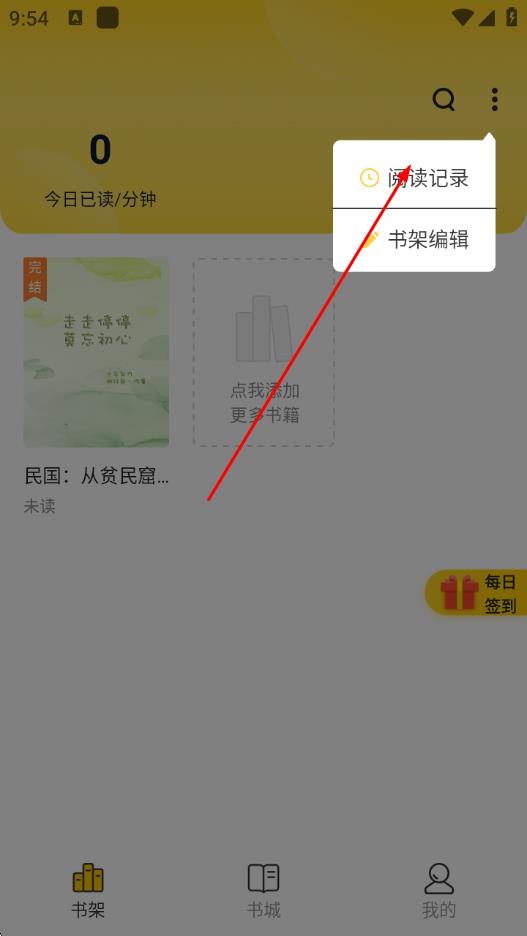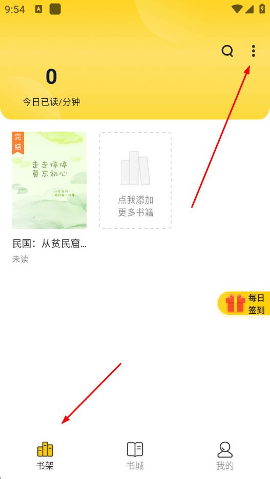 4、也可先點(diǎn)擊底部導(dǎo)航欄中的書架選項(xiàng),進(jìn)入書架頁面,點(diǎn)擊右上角的三個(gè)點(diǎn)圖標(biāo)。