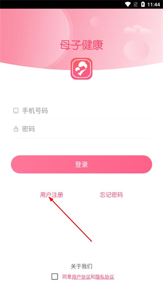 1、打開母子健康A(chǔ)PP,在登錄頁面點擊用戶注冊。
