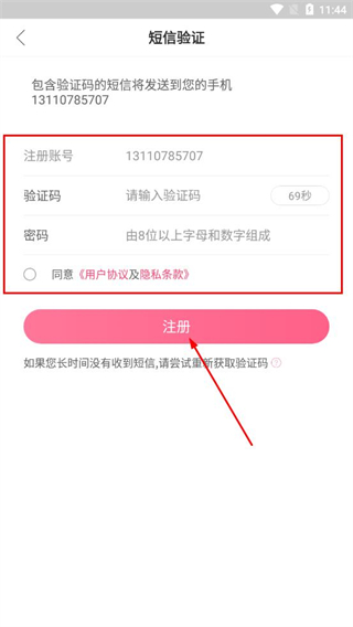 3、輸入驗證碼,設(shè)置密碼,勾選用戶協(xié)議,點擊注冊,完成賬號注冊。