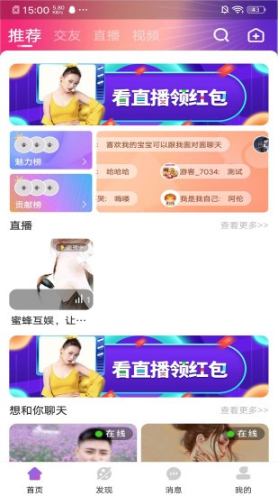 蜜蜂互娛社交軟件不僅有星光熠熠的大牌云集,也有草根平民展示自我,是一個集唱歌、舞蹈、聊天、視頻等多功能于一體的真人娛樂直播平臺。站內(nèi)直播內(nèi)容潮流全面,高顏值主播新穎獨特,粉絲零距離實時與偶像互動,趣味橫生,用戶體驗良好。人生沒有彩排,每天都是直播。