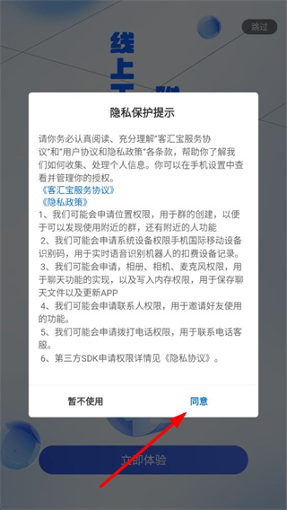 1、在隱私保護(hù)提示彈窗中點(diǎn)擊同意,進(jìn)入下一步操作。