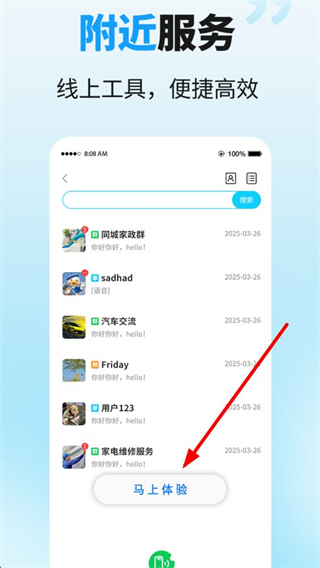 2、在附近服務(wù)介紹頁面點(diǎn)擊馬上體驗(yàn),進(jìn)入登錄界面。