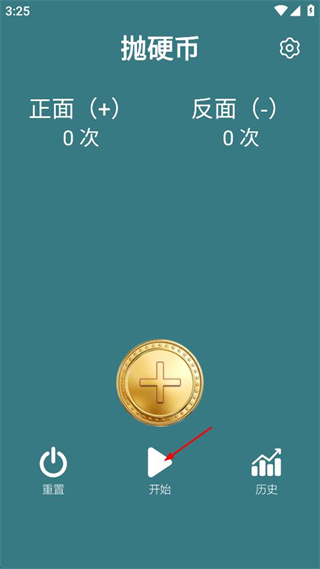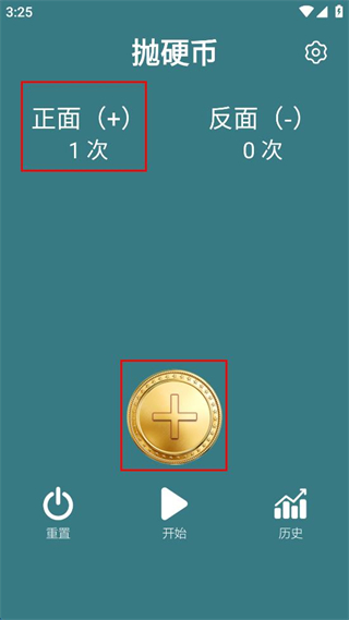 4、可多次點(diǎn)擊“開始”進(jìn)行拋擲,頁面會(huì)統(tǒng)計(jì)正面和反面的次數(shù)。