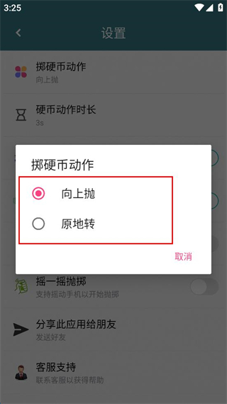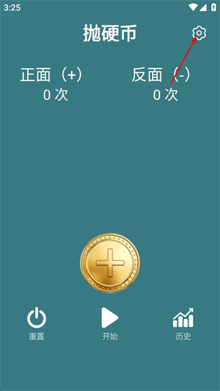 1、打開拋硬幣軟件,點(diǎn)擊右上角設(shè)置圖標(biāo),選擇擲硬幣動(dòng)作向上拋或原地轉(zhuǎn)。