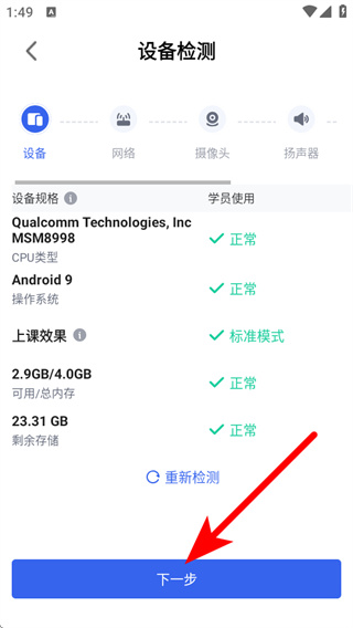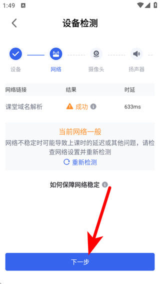 3、網(wǎng)絡(luò)檢測(cè)完畢后點(diǎn)擊下一步,進(jìn)入攝像頭檢測(cè)環(huán)節(jié)。
