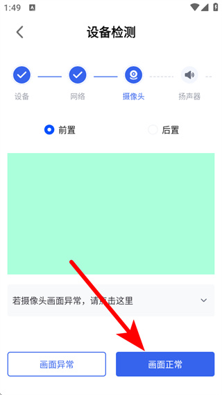 4、確認(rèn)攝像頭畫面正常,點(diǎn)擊畫面正常,進(jìn)入揚(yáng)聲器檢測(cè)。