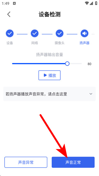 5、確認(rèn)揚(yáng)聲器聲音正常,點(diǎn)擊聲音正常,完成設(shè)備檢測(cè)。