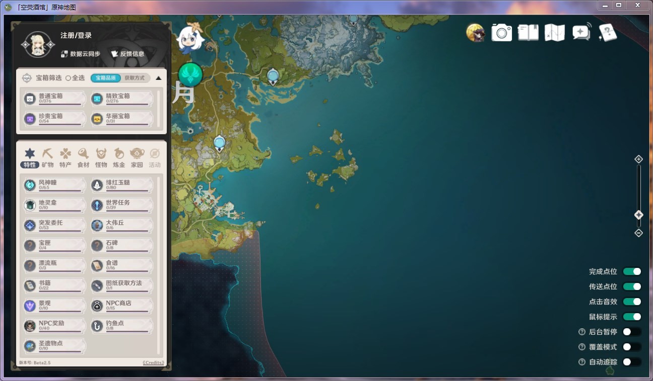 原神pc端地圖輔助工具空熒酒館專門為原神的玩家提供的地圖查看器,在這里你可以查看原神地圖的全貌,各種資源分布一清二楚,可以自由篩選每個國家的特產(chǎn),還能顯示秘境、寶箱、仙靈以及神瞳等,讓玩家可以輕松采集地圖上的資源。歡迎有需要的朋友下載使用!