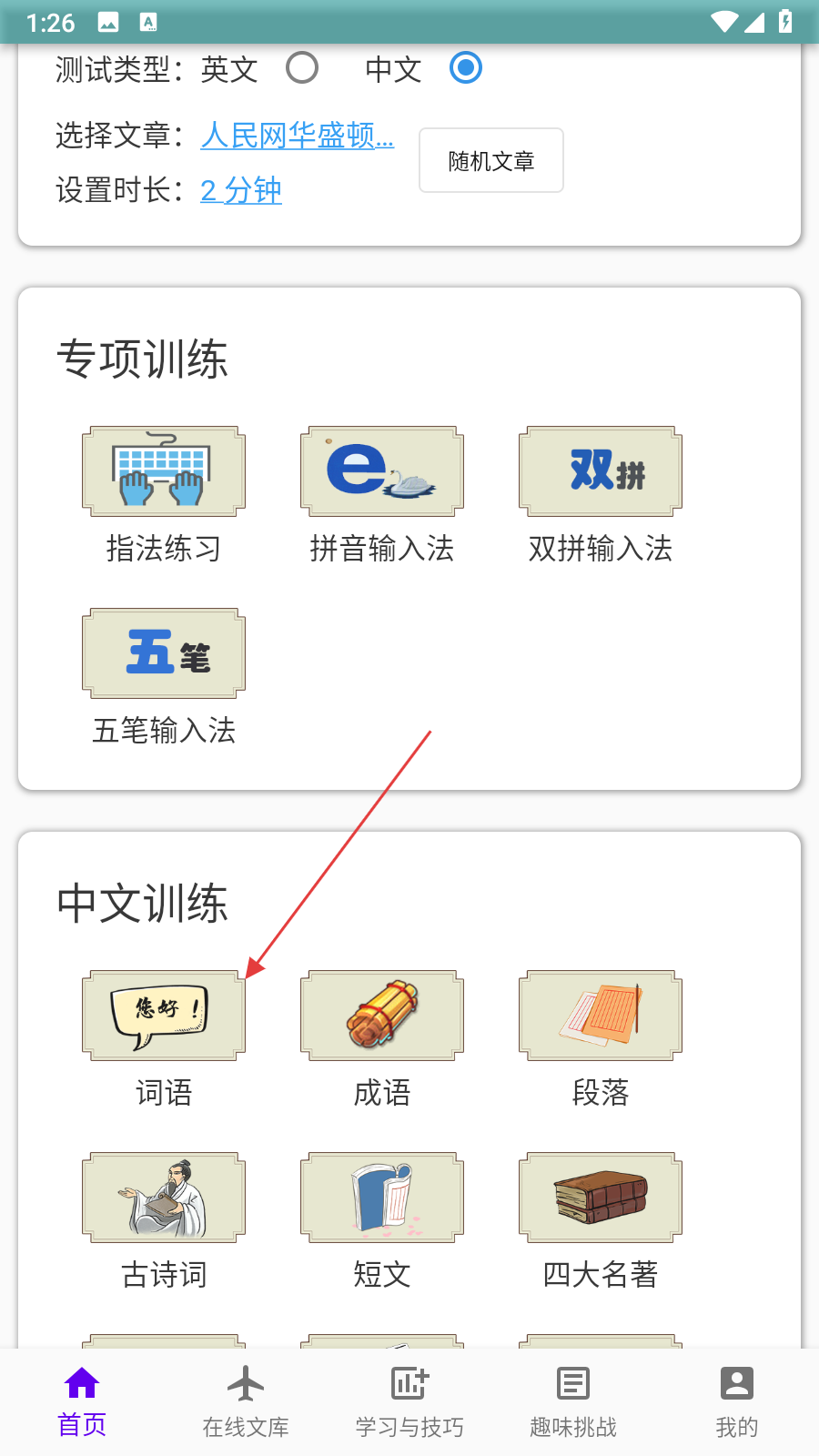 1、打開只語打字訓(xùn)練軟件,在首頁中文訓(xùn)練板塊中,點擊詞語選項。