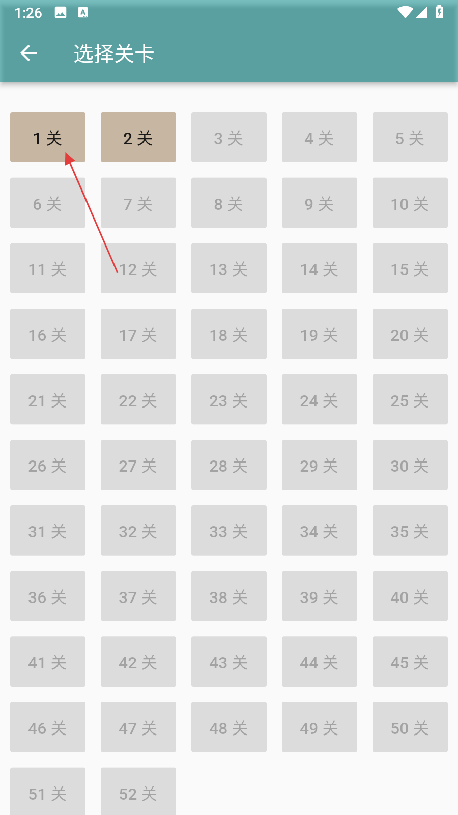 2、在選擇關(guān)卡頁面,點擊1關(guān),開啟第一關(guān)的詞語打字練習(xí)。