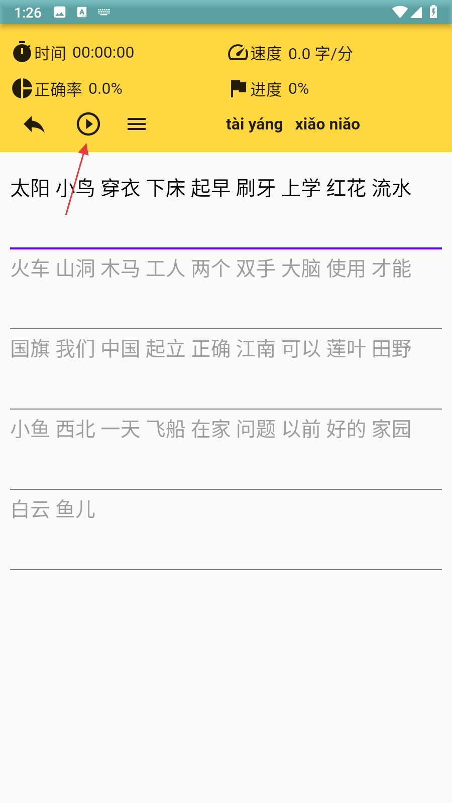 3、進(jìn)入打字界面后,點擊播放按鈕,根據(jù)屏幕顯示的詞語進(jìn)行輸入,界面上方會實時展示時間、打字速度、正確率、進(jìn)度等數(shù)據(jù)。