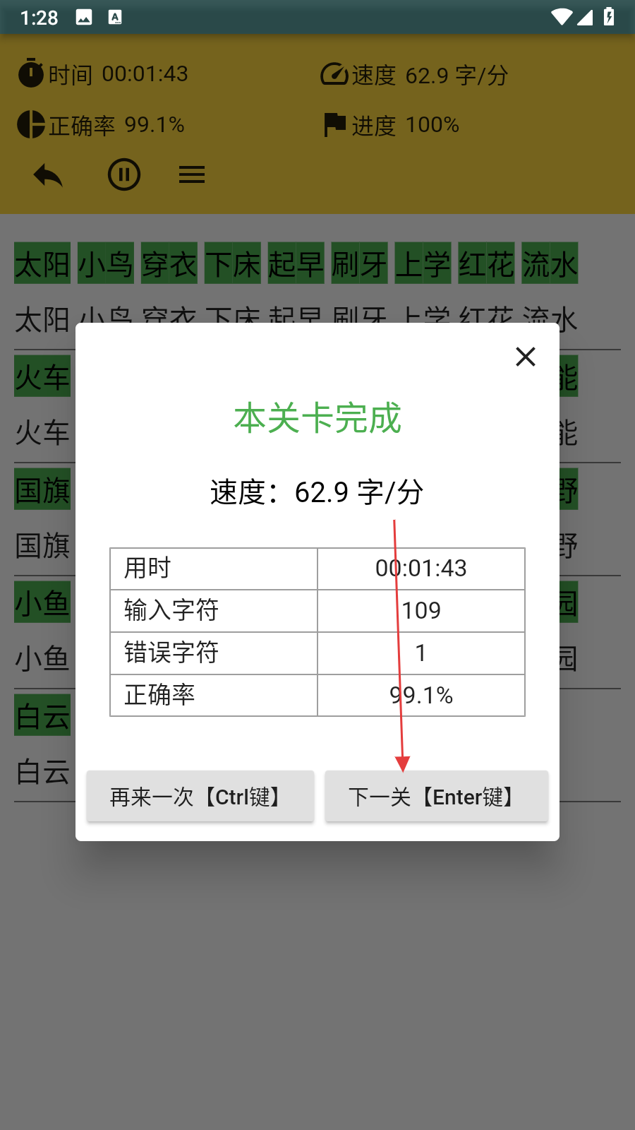 4、完成當(dāng)前關(guān)卡后,會彈出本關(guān)卡完成的成績統(tǒng)計彈窗,點擊下一關(guān)可進(jìn)入下一關(guān)繼續(xù)詞語訓(xùn)練。
