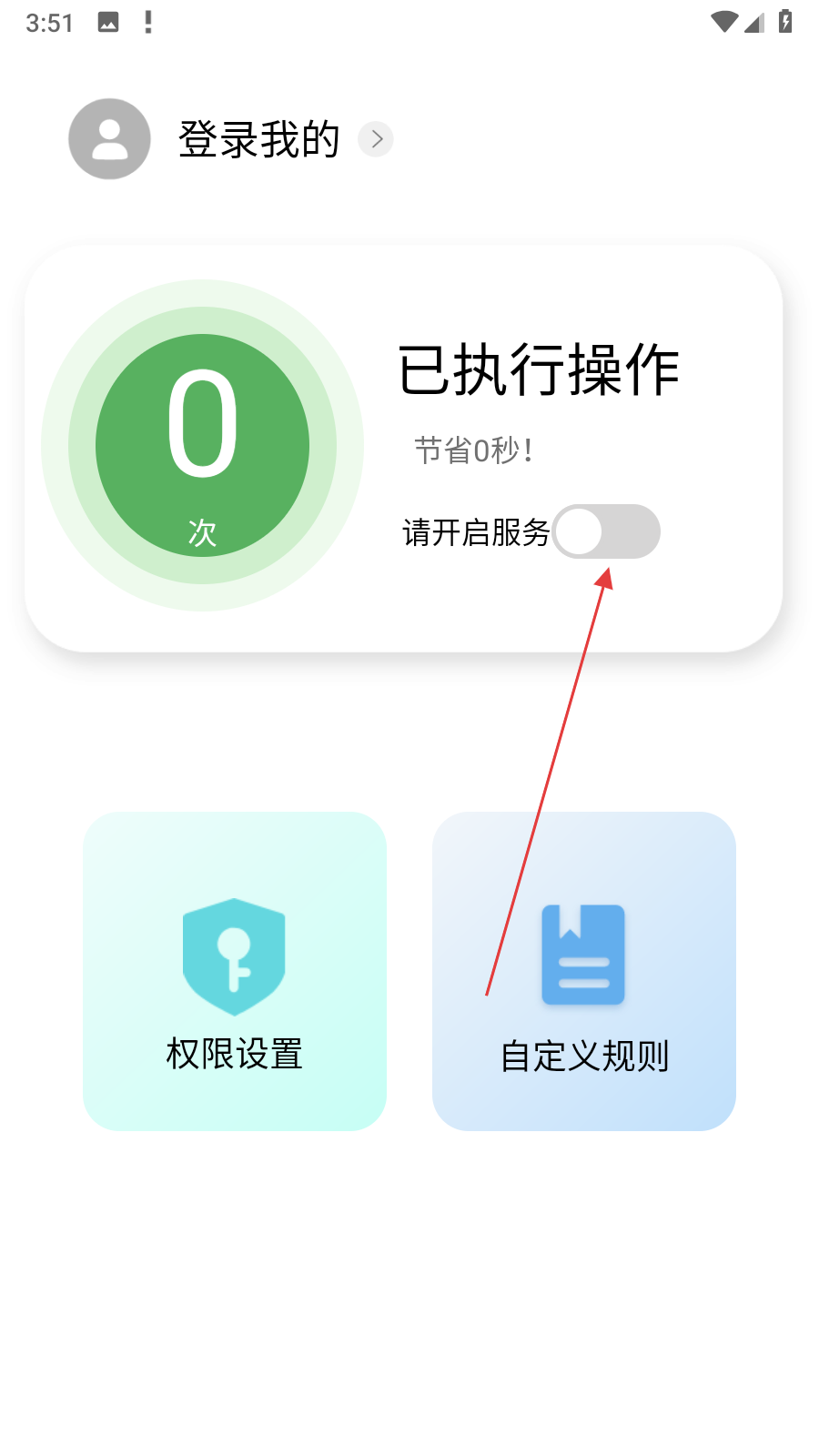 1、打開綠去廣告App,在主界面的已執(zhí)行操作板塊中,點(diǎn)擊請開啟服務(wù)右側(cè)的開關(guān)按鈕。
