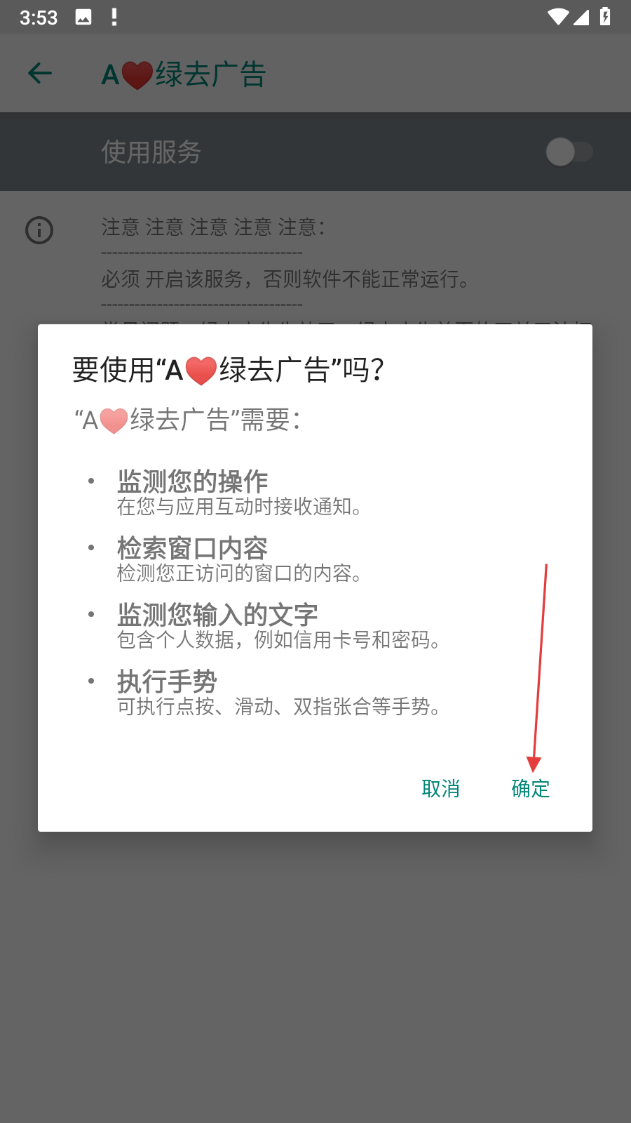 3、在無障礙設(shè)置頁面中,找到選項并點(diǎn)擊進(jìn)入,然后打開使用服務(wù)開關(guān),在彈出的確認(rèn)使用提示框中,點(diǎn)擊確定,即可成功開啟綠去廣告App的服務(wù)權(quán)限。