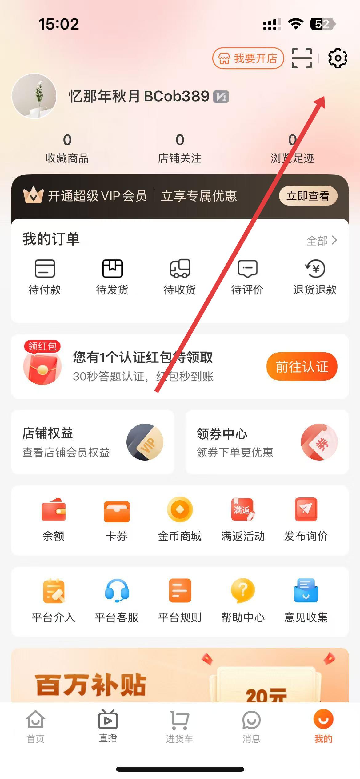1、打開批批網(wǎng)APP,點擊底部導(dǎo)航欄中的我的選項,在我的頁面右上角,點擊齒輪圖標(biāo)進(jìn)入到設(shè)置界面。