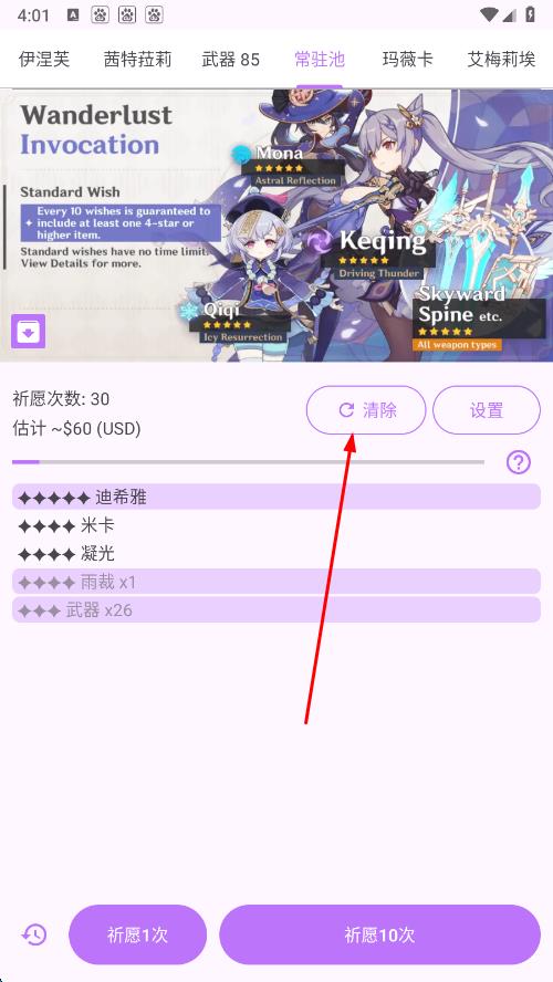 1、在原神抽卡模擬器界面,找到清除按鈕并點擊,可清除當(dāng)前顯示的祈愿次數(shù)和抽卡結(jié)果記錄 。