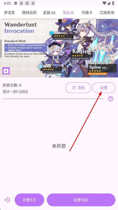 3、若想進行更徹底的設(shè)置,比如清除所有歷史祈愿記錄,點擊設(shè)置按鈕。