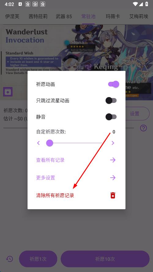 4、在彈出的設(shè)置菜單中,找到清除所有祈愿記錄選項,點擊即可刪除模擬器保存的所有祈愿數(shù)據(jù)。