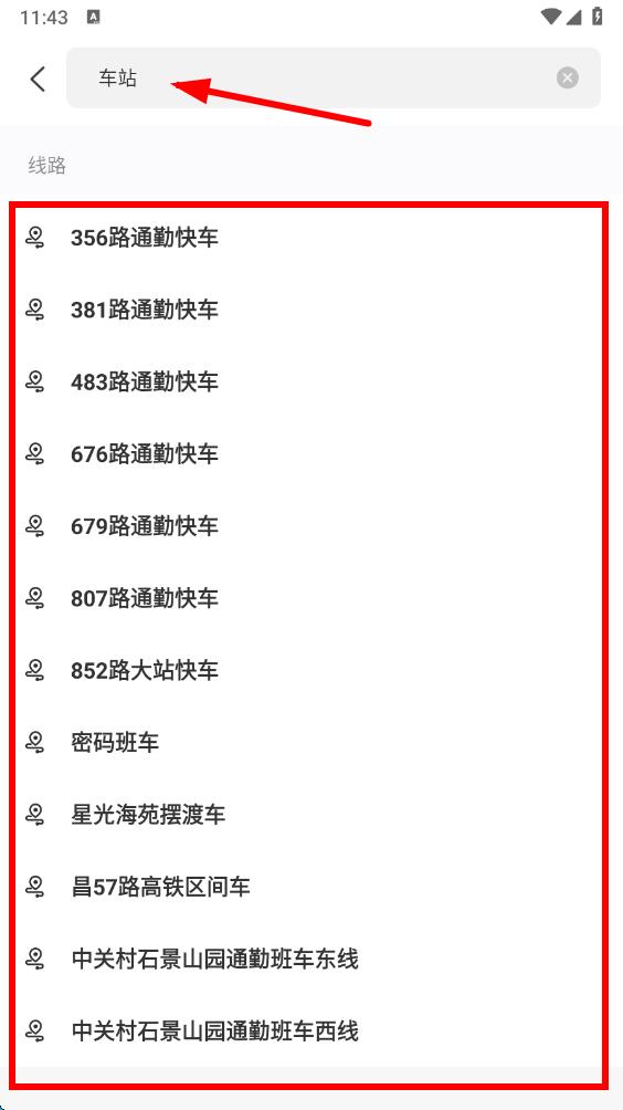 3、在搜索框中,輸入想要設置提醒的公交車站或公交線路關鍵詞,隨后會出現(xiàn)相關的公交線路列表,從中選擇目標公交線路。
