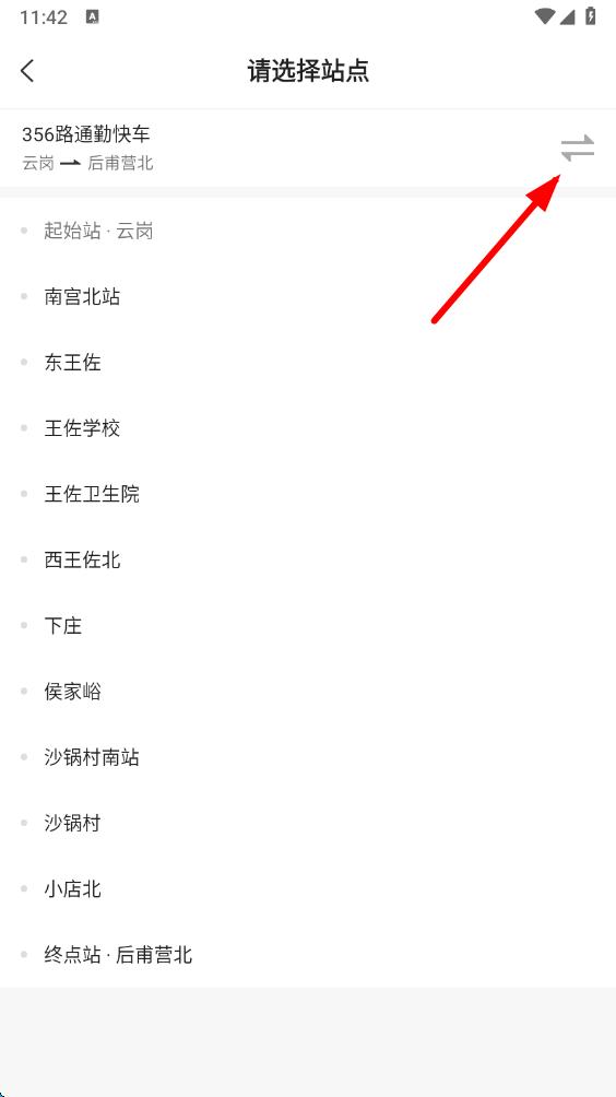 4、選擇公交線路后,進入站點選擇頁面,可根據(jù)需求點擊箭頭圖標切換線路方向,并選擇具體站點,完成公交車提醒功能的添加。