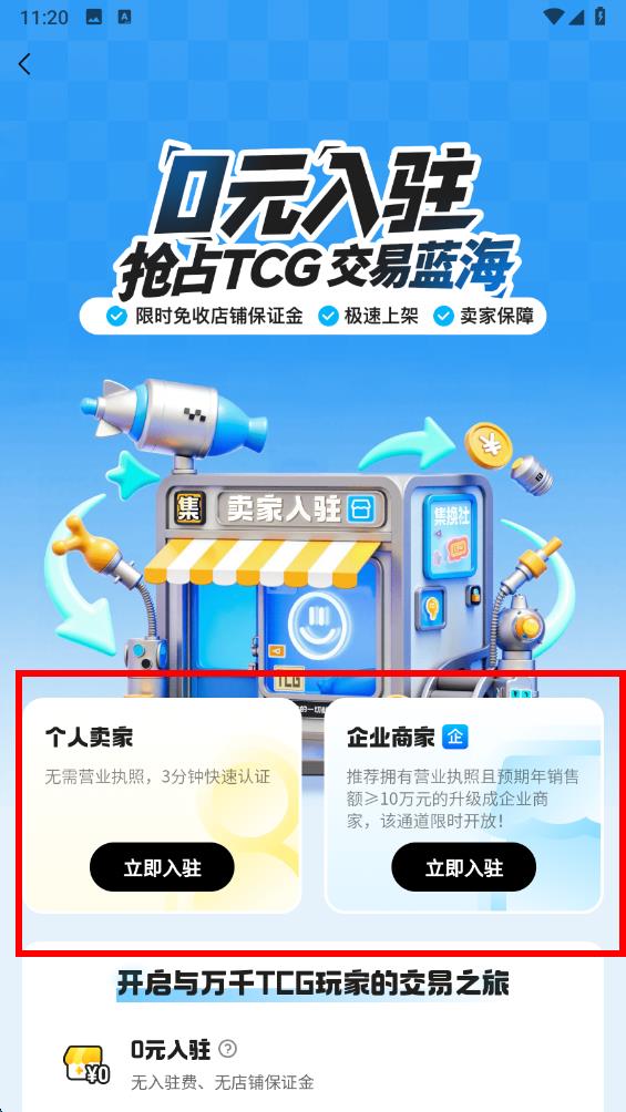 3、進(jìn)入出售商品流程后,根據(jù)自身情況選擇個(gè)人賣家或企業(yè)商家入駐類型,完成入駐認(rèn)證流程后,按照提示完善卡牌商品信息并發(fā)布,即可在平臺上售賣你的卡牌。