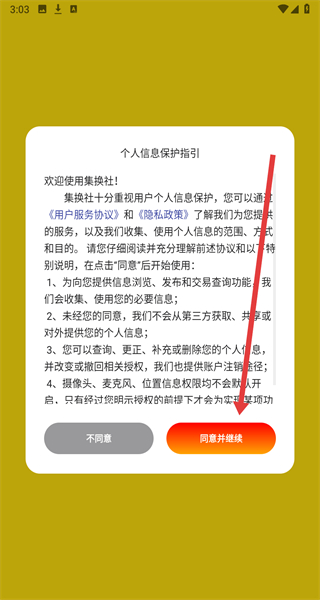 1、點(diǎn)擊“個(gè)人信息保護(hù)指引”彈窗的“同意并繼續(xù)”,進(jìn)入集換社APP主界面。