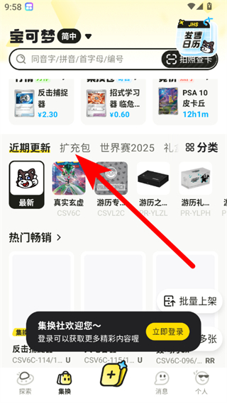2、在集換界面,點(diǎn)擊擴(kuò)充包標(biāo)簽,進(jìn)入擴(kuò)充包分類頁面。