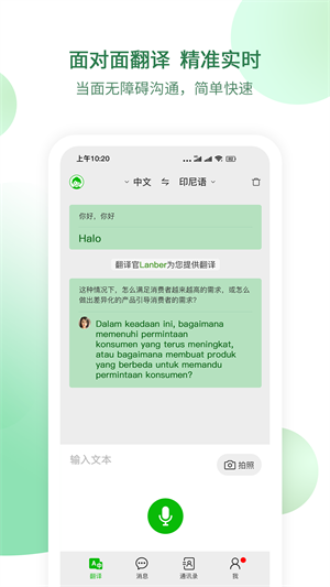 5、多語種翻譯:支持中文、英語、印尼語等多個熱門語言互譯,覆蓋常用語種發(fā)音服務;