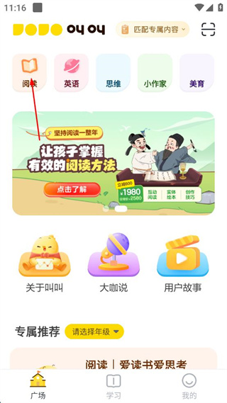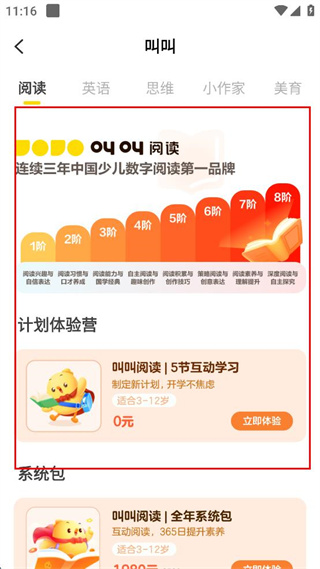 3、在閱讀功能頁(yè)面查看叫叫閱讀的階段劃分,了解各階段閱讀培養(yǎng)重點(diǎn)。
