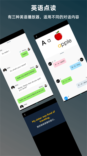 - 多樣的音樂播放器選擇體驗(yàn),可以播放不同的對話內(nèi)容,自由選擇在線英語點(diǎn)讀,快速讀懂對話內(nèi)容;