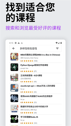 Udemy學(xué)習(xí)平臺是手機上的學(xué)習(xí)助手,各種類的課程在線選擇學(xué)習(xí),隨時學(xué)習(xí)全新技能,仿佛自己的技能點,讓你的工作更加高效,大家可以根據(jù)自己的喜好來學(xué)習(xí),向全球各地的從業(yè)者、領(lǐng)導(dǎo)者、專家學(xué)習(xí),大大提升自己的課程掌握。
