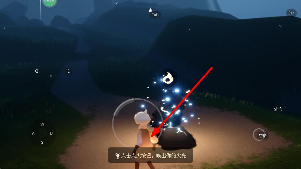 3、當(dāng)出現(xiàn)點(diǎn)擊點(diǎn)火按鈕,喚出你的火光提示時(shí),點(diǎn)擊對(duì)應(yīng)交互按鈕,用角色蠟燭火光驅(qū)散黑暗,完成點(diǎn)火操作。