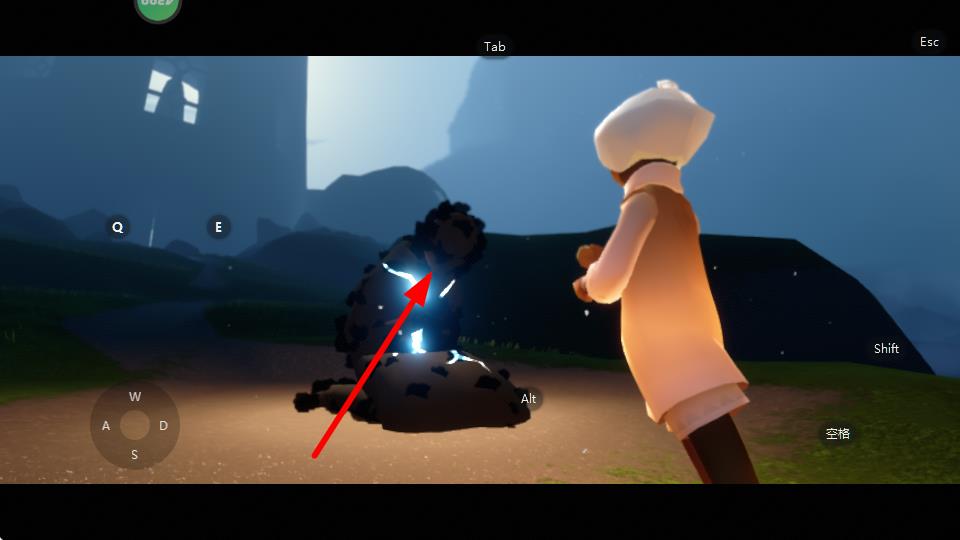 2、找到被黑暗包裹、帶有藍(lán)光的先祖或目標(biāo)物體,靠近后,能看到藍(lán)光閃爍處,這就是要點(diǎn)火互動(dòng)的關(guān)鍵位置。