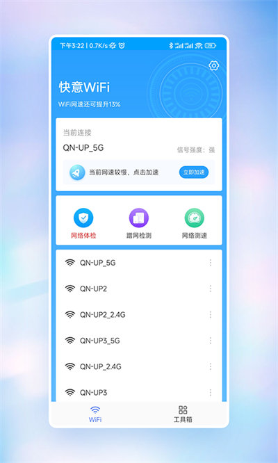 快意WiFiapp是一款非常好用的手機網(wǎng)絡(luò)優(yōu)化軟件,能夠幫助用戶管理手機的無線網(wǎng)絡(luò),顯示各種網(wǎng)絡(luò)信息,還能輔助用戶下載各種軟件、文件等,滿足用戶的各種需求,用戶在使用網(wǎng)絡(luò)時,可以在這里查看最快的網(wǎng)絡(luò),直接連接,還有圖表的形式展示,非常清晰。
