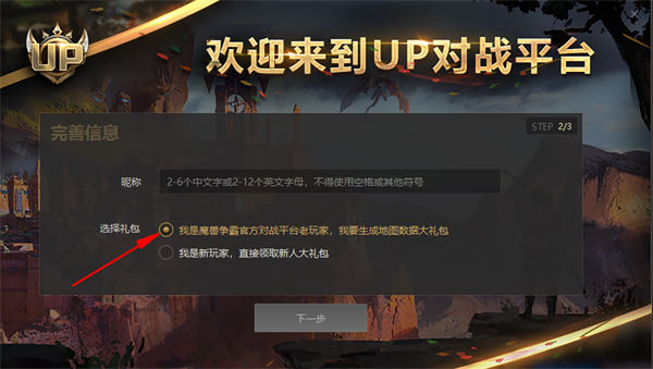第三步:填寫之前的昵稱,重點一定要選:我是魔獸爭霸官方對戰(zhàn)平臺老玩家,我要生成地圖數(shù)據(jù)大禮包