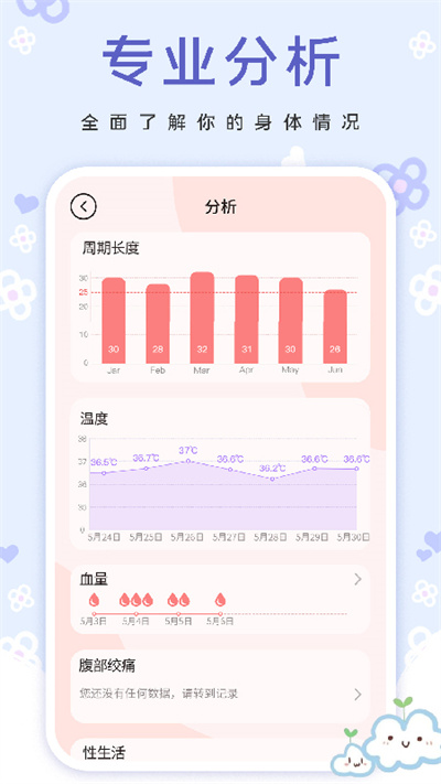 1、輕量級:小巧但功能齊全,使用起來毫無門檻,滿足經(jīng)期預(yù)測和健康監(jiān)管所有所需