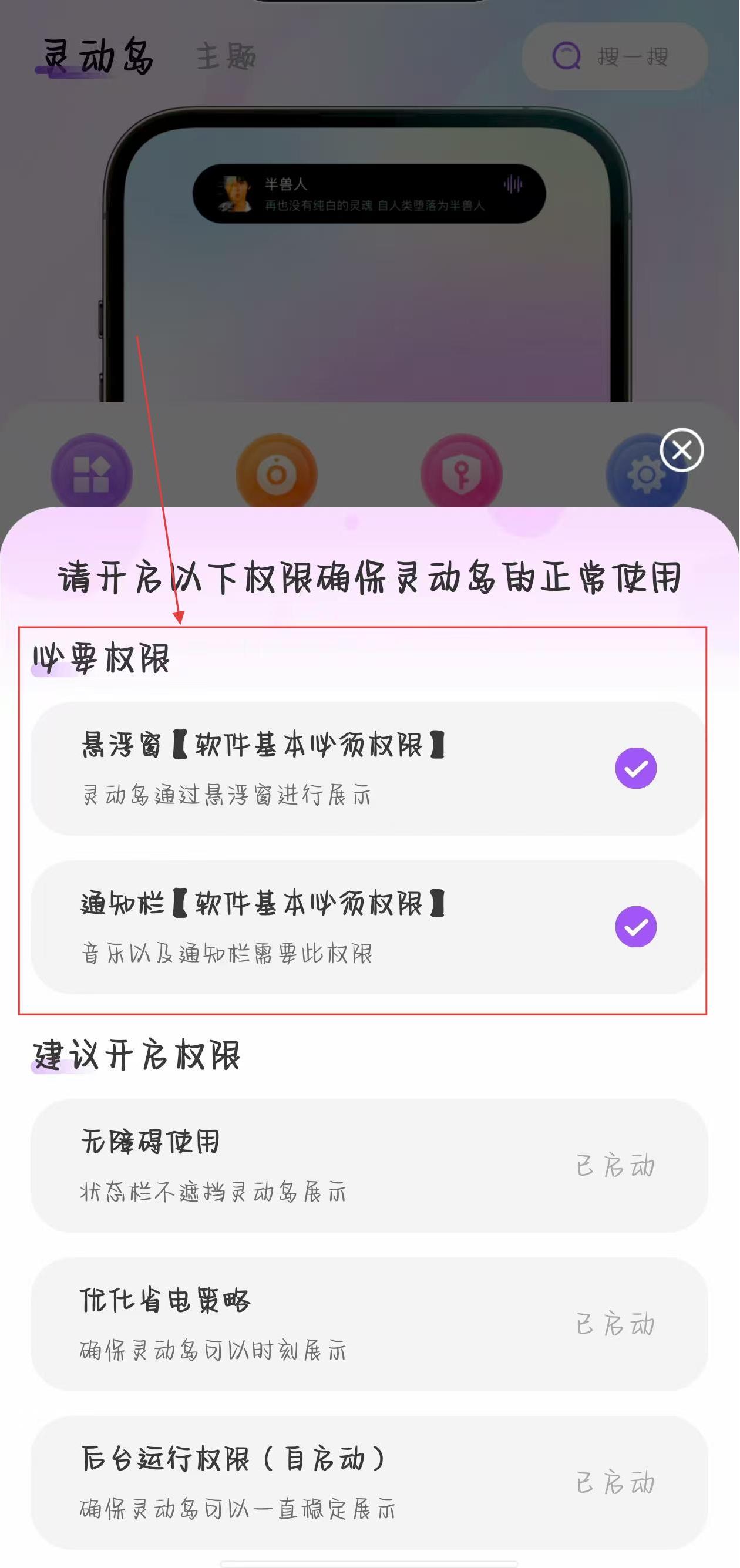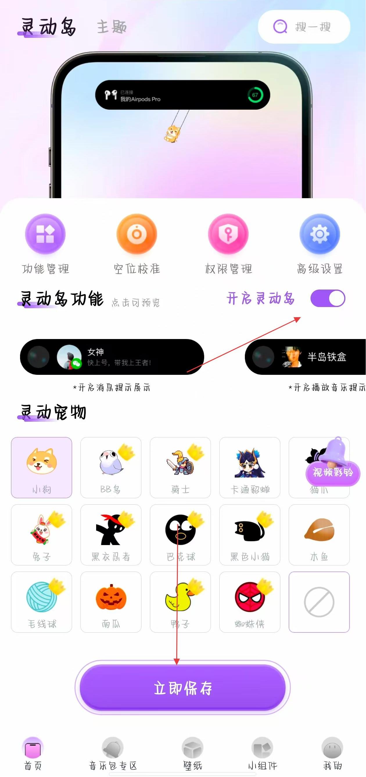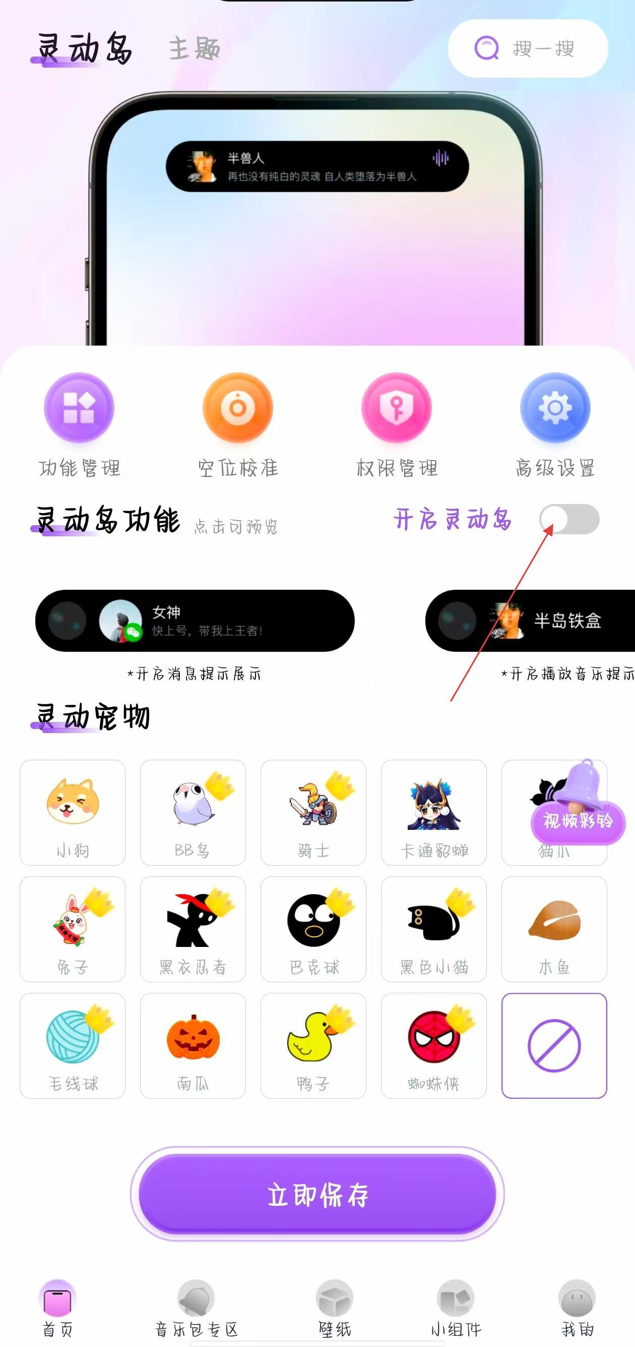 4、權限開啟好后,返回靈動塢首頁,開啟靈動島開關,選擇靈動寵物然后點擊頁面下方立即保存按鈕即可。