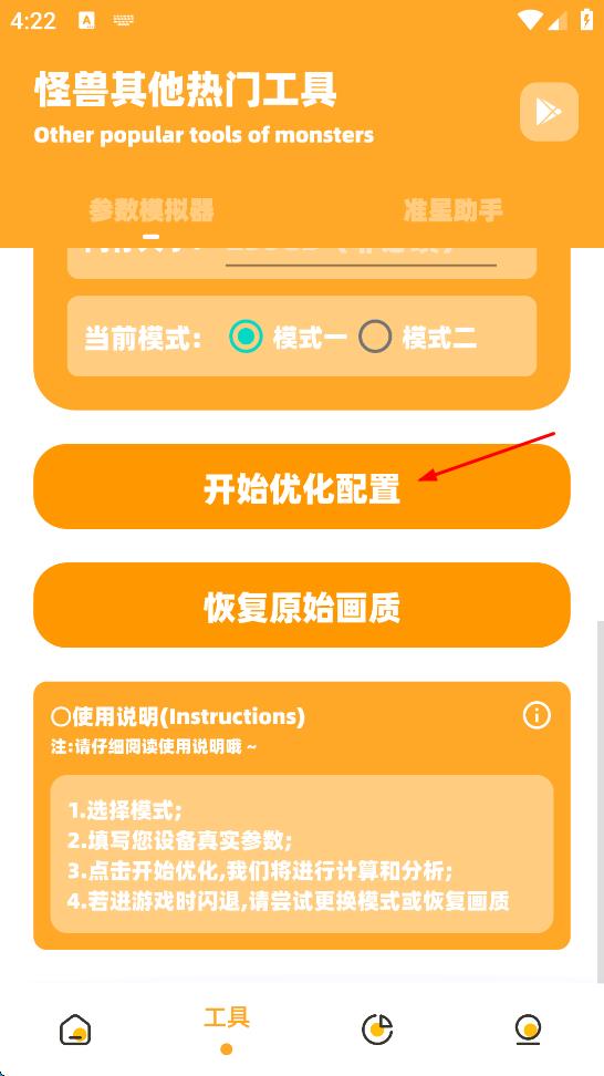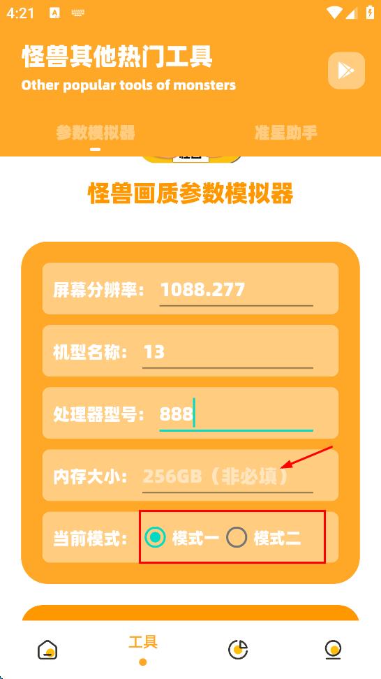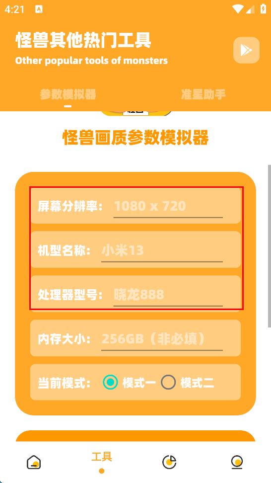 2、在工具頁面的怪獸畫質(zhì)參數(shù)模擬器中,依次填寫屏幕分辨率、機型名稱、處理器型號等設(shè)備參數(shù)。