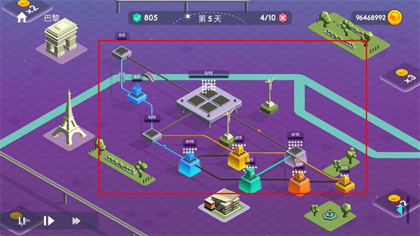 3、觀察關(guān)卡內(nèi)的設(shè)施布局,通過操作相關(guān)功能按鈕,搭建包裹運(yùn)輸?shù)木€路網(wǎng)絡(luò)。
