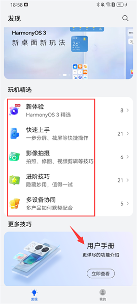 1、點擊進入玩機技巧軟件,在發(fā)現(xiàn)欄目有則豐富的電子說明書,頑疾精選推薦以及用戶手冊等;