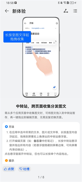 3、點擊新體驗,會教大家如何在多個應(yīng)用中手機圖文,將圖文拖入中轉(zhuǎn)站暫存,在一鍵拖出到編輯頁面,不需要反復(fù)不斷的切換頁面;